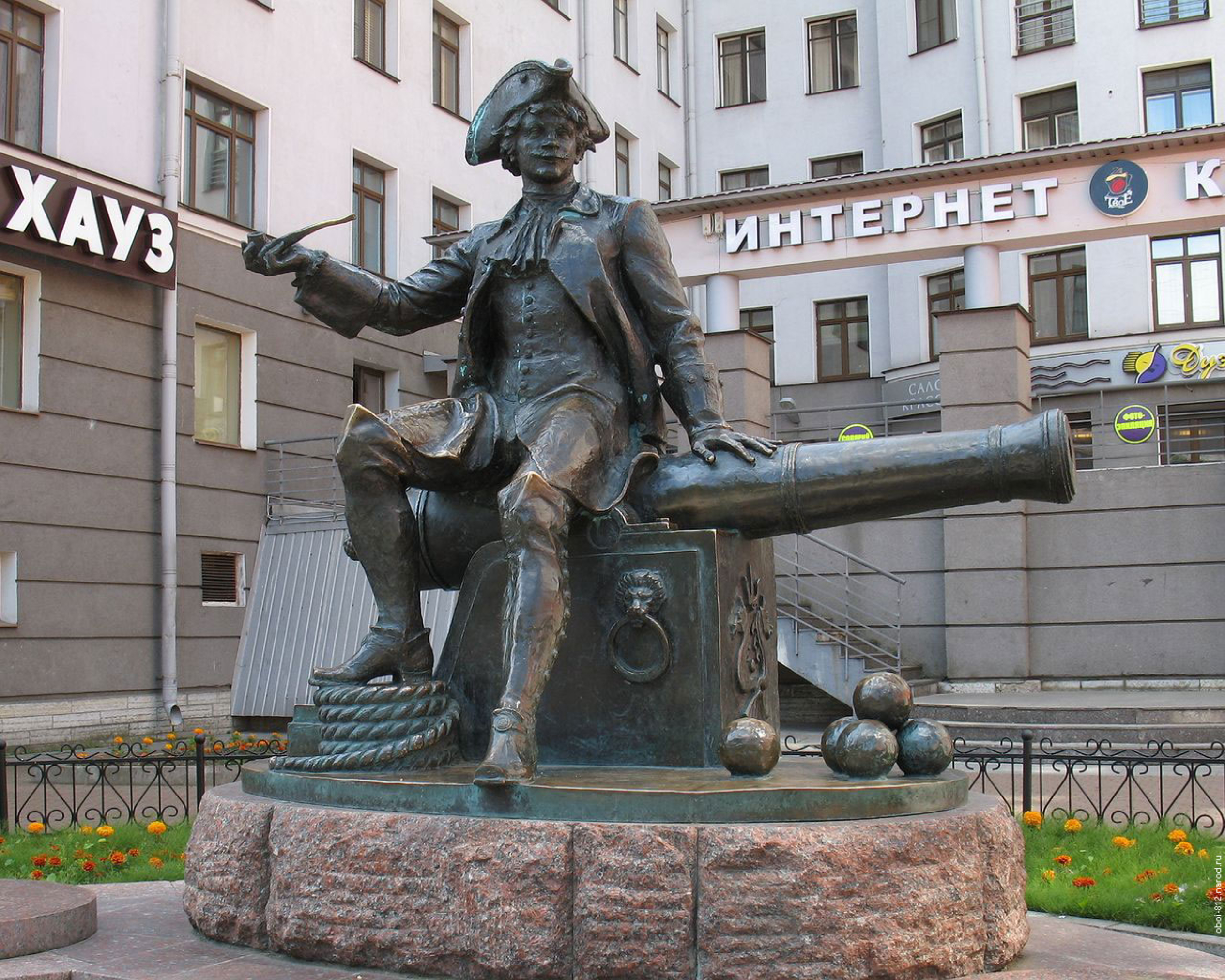 Знакомство с памятниками и улицами — памятники конке и бомбардиру Корчмину, дом Тани Савичевой, самая узкая улица Петербурга.